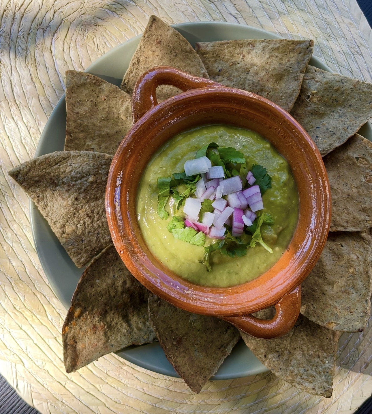 Guacamole con un toque de cebolla morada y cilantro; acompañado con totopos de maÃz azul.