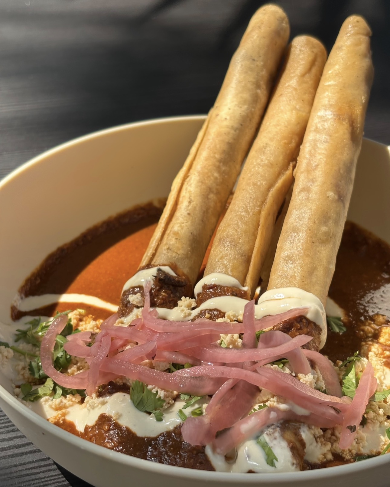 3 flautas rellenas de barbacoa, ahogadas en salsa a elegir: verdes o encacahuatadas, con crema, queso fresco, cilantro y cebolla encurtida.