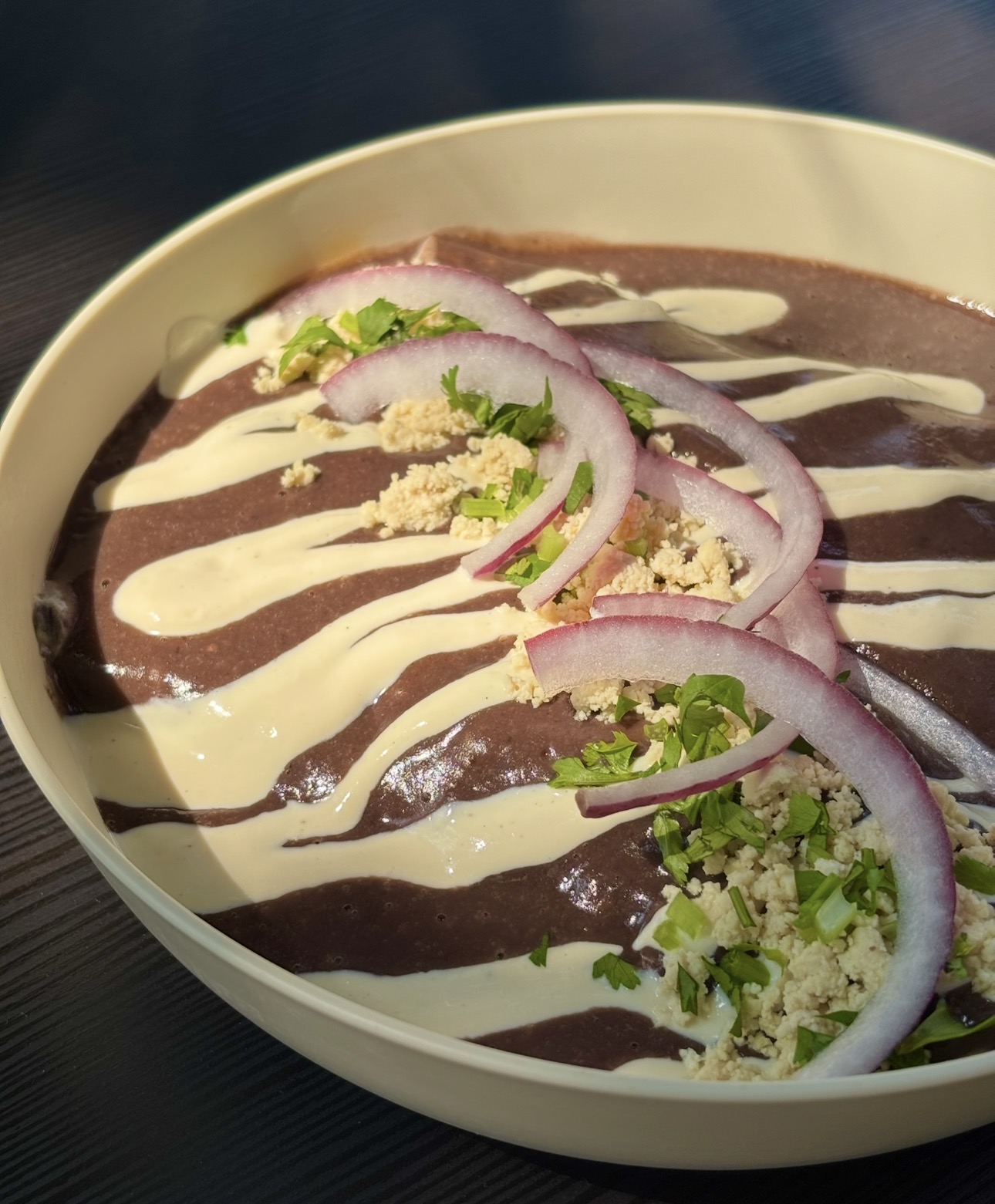Orden de enfrijoladas. 3 tortillas hechas a mano, rellenas de cualquier guisado de tu elección, bañadas en frijol negro perfumado con epazote; con crema, queso fresco, cilantro y cebolla morada.