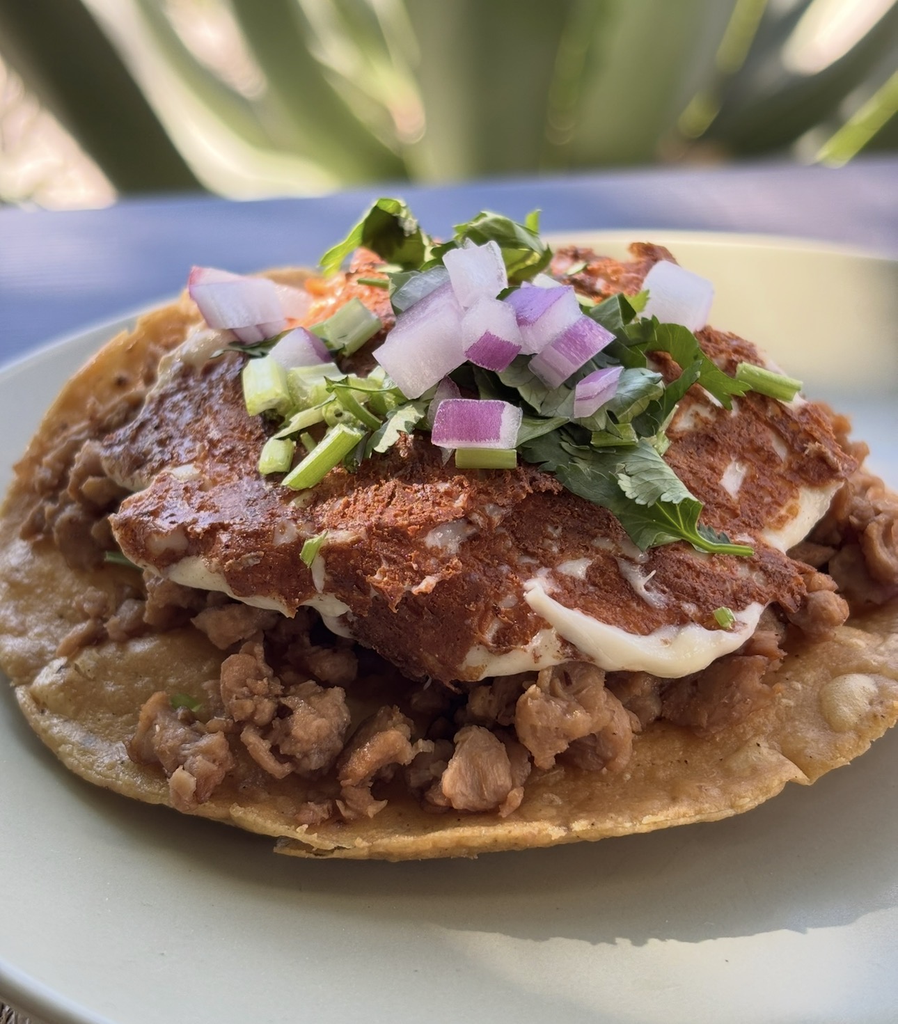 Tortillitas frita y crujiente con tu proteína favorita, servida con una costra de queso gratinado, cilantro y cebolla morada.